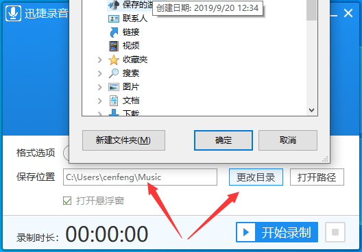 4、随后保存位置确认或更改音频录制后存储到电脑的位置,需要修改保存位置时可以在输入框中写入路径,也可以点击更改目录按钮选择路径。