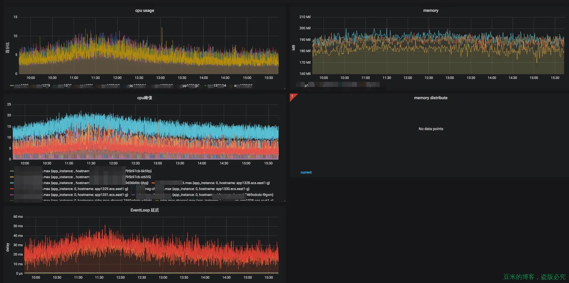 网关开发工作中难免会监控nodejs服务器的运行情况,nodejs的进程运行以及流量我们可能会使用grafana来展示,下图是展示我们其中一个网关项目的运行状态(包括CPU、内存、堆栈使用、Event loop的延时情况以及GC情况(GC的截图放不下了~)):