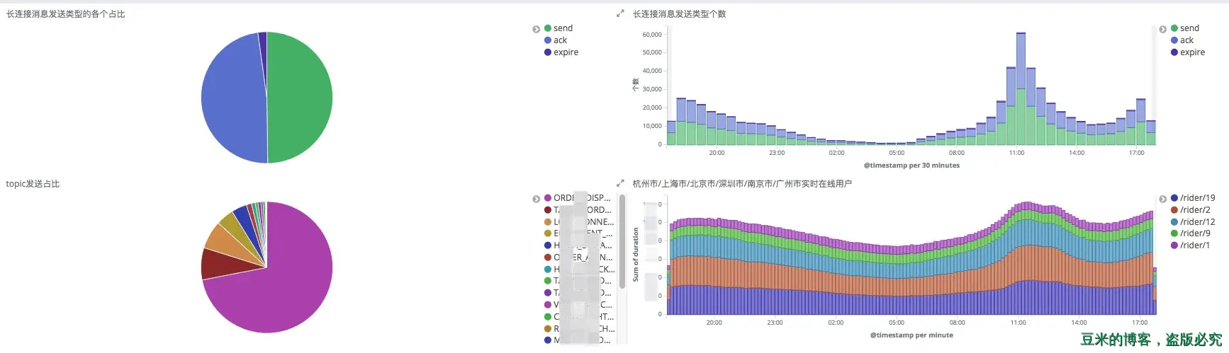 在之前的效果图中,我们利用饼图来直观描述发送请求的成功与失败比例,在后一张效果图中,我们用来表示长连接消息发送类型的分布比例,所以涉及到比例展示的无疑使用饼图是最佳方案。