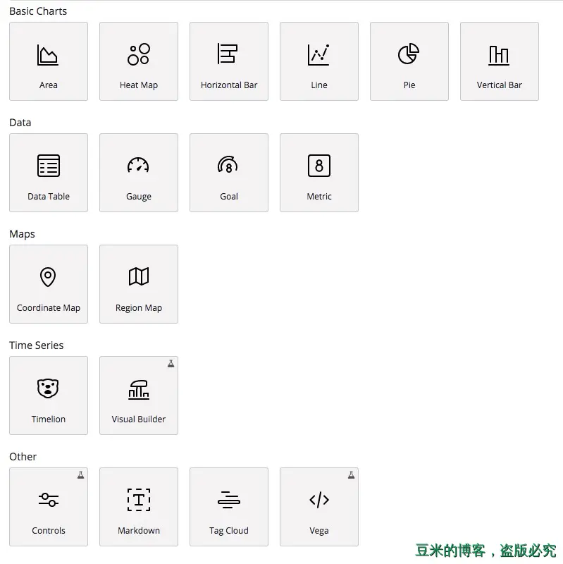 点击Visualize之后,我们可以看到有个+的按钮,点击加号之后,可以看到kibana提供了众多的图表展示: