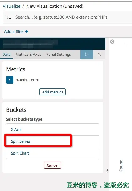 于是我们开始配置,记得点击上图红框中的配置(上图的kibana是新版的Version: 6.5.4,点击的配置叫做Split Series,而旧版本的kibana界面(Version: 5.6.3)点击的配置叫做Split Slices),配置结果如下: