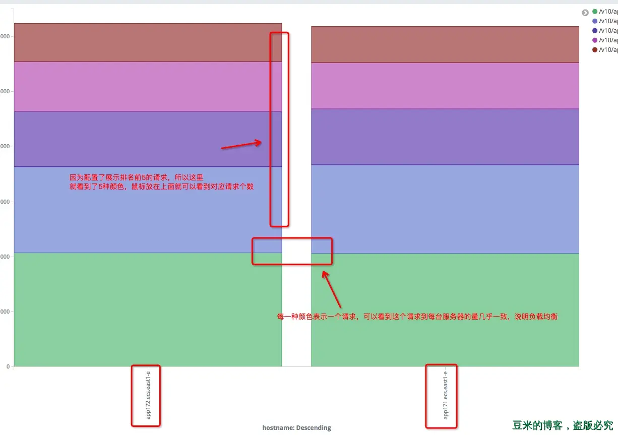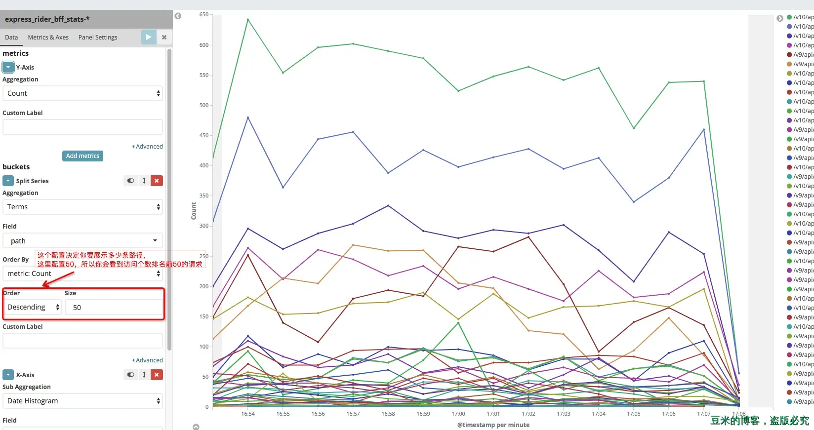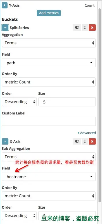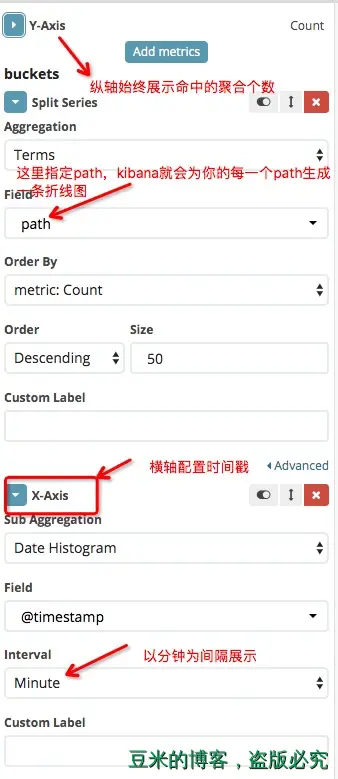 折线图来展示上述效果图中每一条请求在单位时间内的个数,利用kibana的分类功能,我们使用下面的配置: