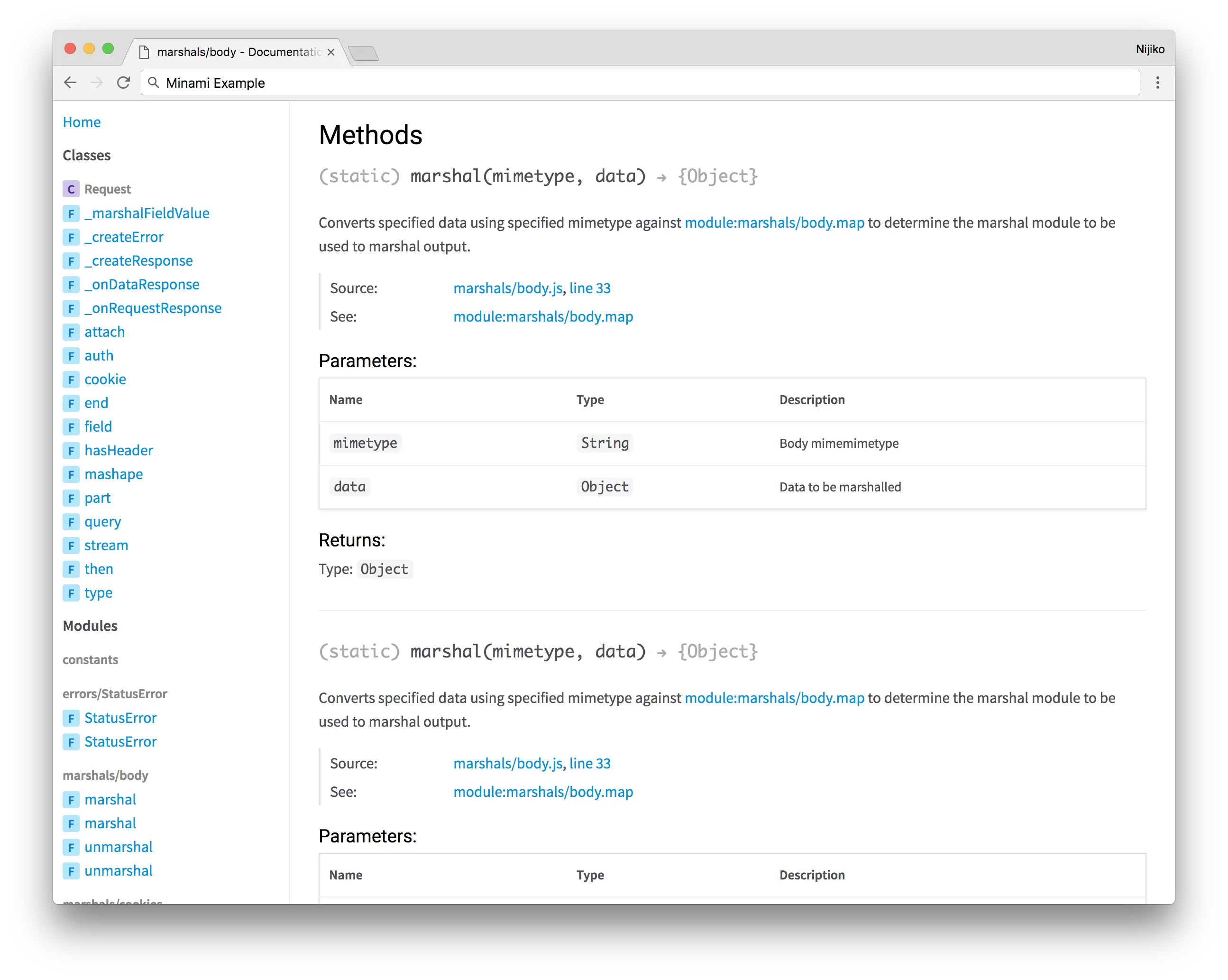 上面这张是用JSDoc的模板工具minama生成的文档,可以看到他的功能有以下几个: