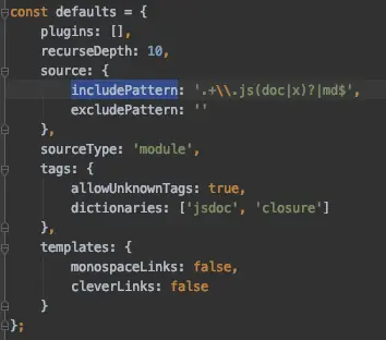 node_modules/jsdoc/lib/jsdoc/config.js中做了includePattern的默认配置,这里我们给正则添加md结尾的识别