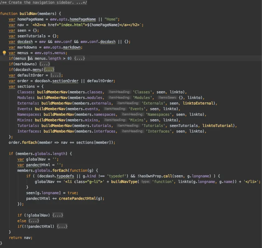 接下来直接到了渲染部分,我们用到了docdash模板,以上的代码是docdash的publish.js里来渲染nav模块,我们可以看到除过global,其他都是用buildMemberNav方法去渲染,上边还有判断是否是全局文档,通过文件名称的前缀为GLobal_来识别,把这部分放在对应的目录下面