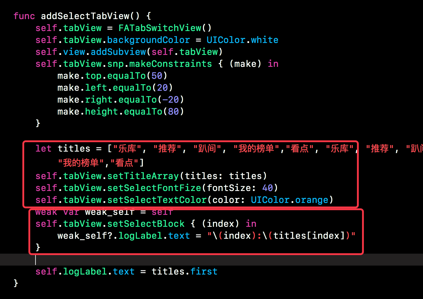 今日头条也是有类似选中放大Tab的效果,但是与下方的这个放大效果大大不同,可以说 “今日头条” 内个切换放大的效果实现起来是比较简单的,因为其放大是基于Select Tab的中心往四周放大,并且放大后会虚掉,基于这个特点,今日头条的Select放大效果应该是通过Scale来进行放大的。下方是之前实现的类似今日头条的切换效果,具体请移步于“iOS开发之常用资讯类App的分类展示与编辑的完整案例实现(Swift版)”