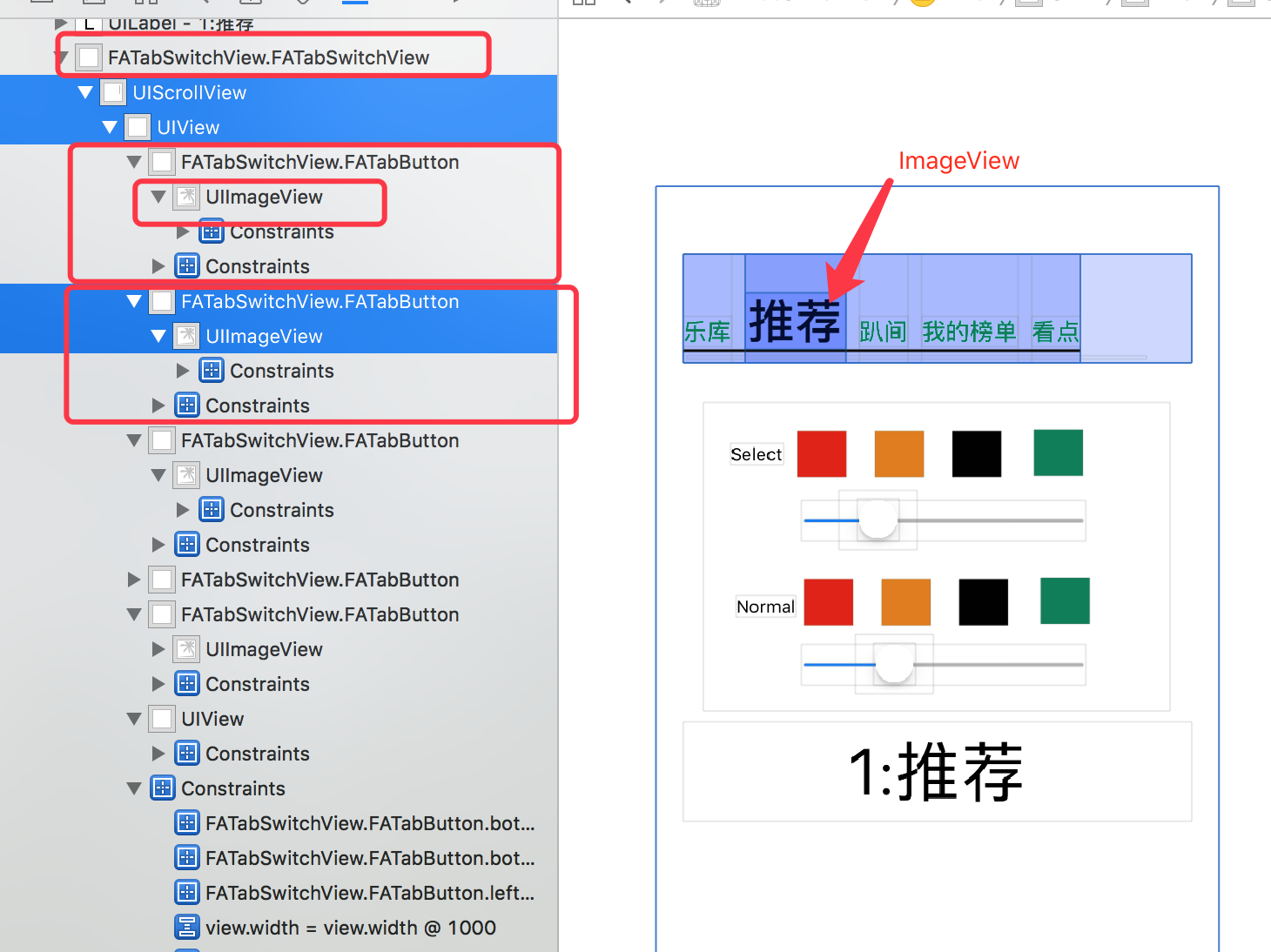先是使用了CollectionView, 然后对CollectionView进行自定义动画,在点击CollectionView的Cell时做放大效果。Cell可以实现上述放大的效果,但是Cell内部的SubView没有放大的动画效果,设置的BackgroundImage也是不行。具体表现出来的现象是Cell放大后,里边的SubView才会放大。该方案被Pass。 然后就使用Scroll + UIButton的方式,发现字体的放大实现不了,虽然字体可使用Scale进行放大,放大后在替换成正常的Font, 但是这种效果实现后并不理想,放大过程还是会虚掉。该方案也是被Pass掉了。 最后选择的方案是ScrollView + 自定义Button的方式来实现。在自定义Button中使用图片的方式来显示Title。也就是先将Title渲染成图片,然后以图片的方式来展示Title。放大缩小这个TitleImage即可。 下方是具体实现的视图层级,可以看出使用的是ImageView来展示的Title。