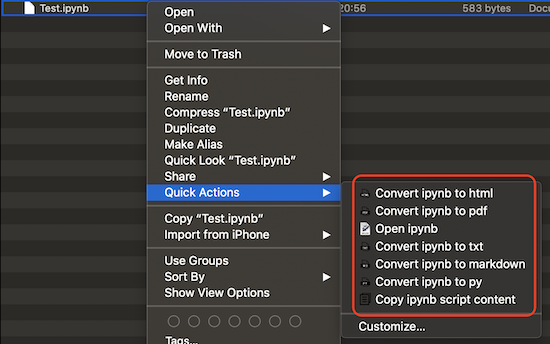 效果:右键ipynb文件弹出菜单,在Quick Actions里面就有各种快捷命令
