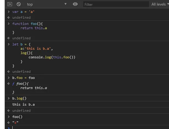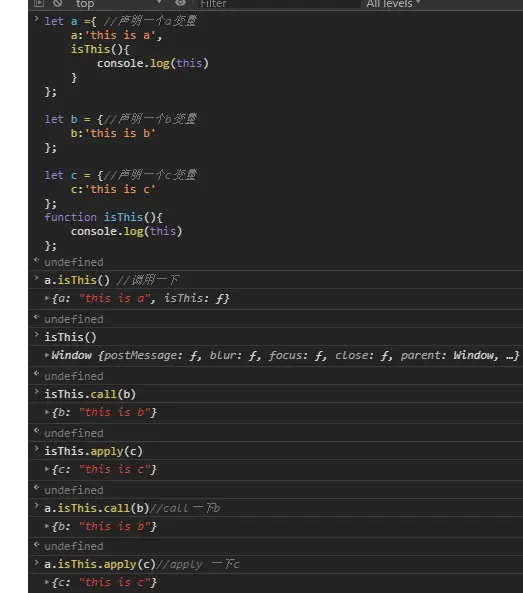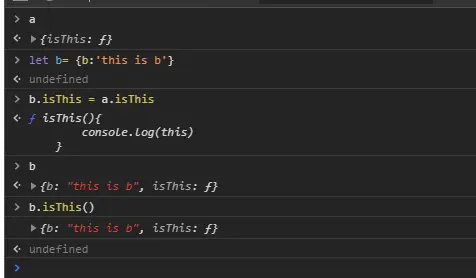 首先我声明了一个b对象,再将a中的isThis方法赋给b,再用b去调用该方法,即打印出来了b对象自己.