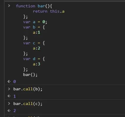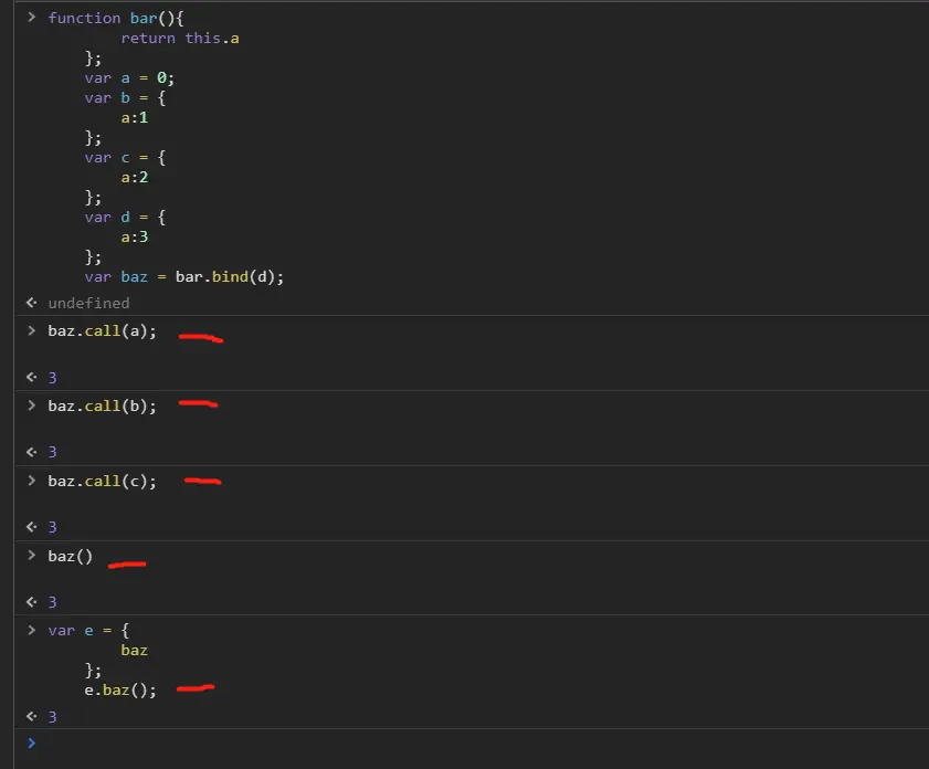这便是硬绑定,baz函数是bar函数通过bind返回的新函数,而bar函数进行了绑定对象d的操作,所以返回的baz函数始终指向d。