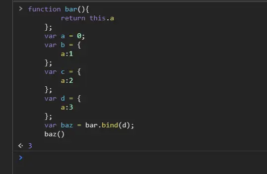 所以,在下列代码中,baz赋值为bar通过bind(d)之后返回的函数