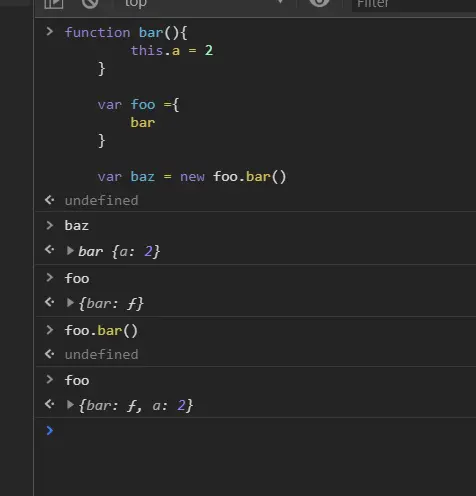 第一个操作中我们是foo调用了bar,但是结果并不是我们预期所想的,foo这个对象会因为调用了bar方法而向自己赋值了a=2这个属性,显然,在被new调用的时候,bar方法里面的this指向了新创建的对象baz,并给baz复制了a=2这个属性,在第二个操作中,bar函数的this才指向了foo,并且给foo赋值a=2这个属性。