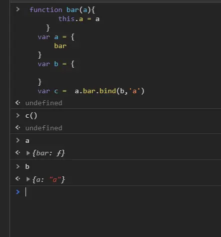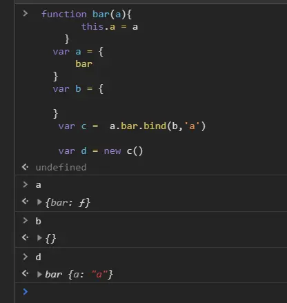 在上面的操作中,我们通过new操作符,调用了a对象的bar函数通过绑定(bind) b对象后返回的c方法,可是c方法并没有像我们之前直接调用c方法那样,this指向了b对象,并且给b对象赋值a='a'这个属性,而是直接将this指向了新创建的d对象(实例),并且给d对象赋值了a='a'这个属性,所以new操作符在this的操作中是优先级最高的。