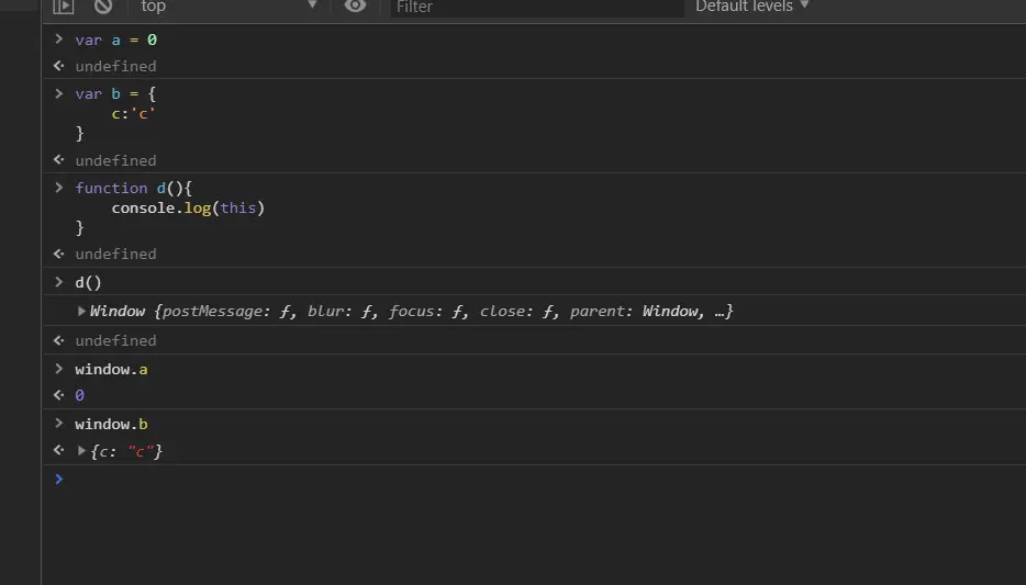 我们再来看第一条:window对象中有个d方法,所以d方法被window调用的时候,this自然指向了window对象.