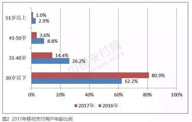 2017年,移动支付端,30岁以下用户占比80.9%,31-40岁占比14.4%,41-50岁占比3.6%,51岁以上占比1%。
