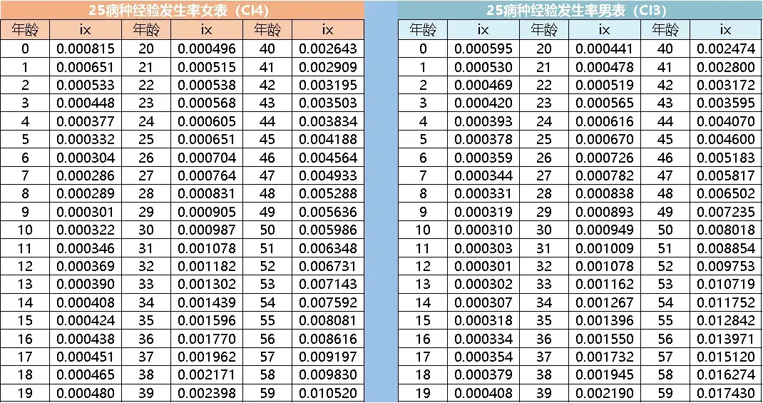 在保监会官网上,我们可以找到《中国人身保险业重大疾病经验发生率表(2006-2010)》具体数字如下: