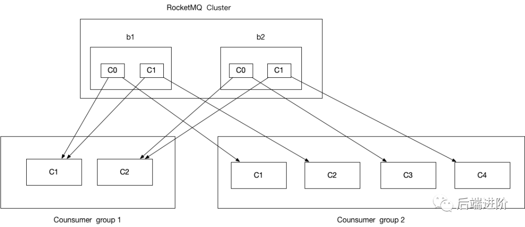 队列会在 broker 中抽象成一个 consumer queue,在集群模式下,每个队列每个消费组只能存在一个消费者进行订阅消费,但是一个消费者可以消费多个队列,这也保证了在集群模式下消息不会被重复消费,如下图所示: