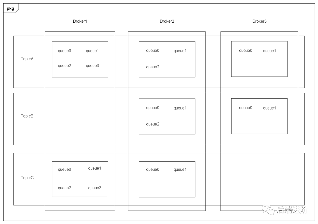 RocketMQ 每个主题都会有若干个队列,分布于集群中各个 broker 上,分布规律如下: