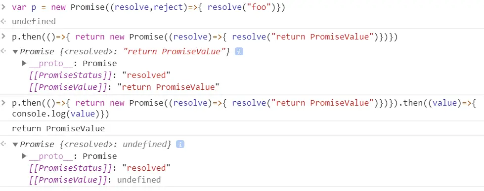 - 返回一个resolved状态的Promise,如果then中的回调函数返回一个已经是成功接受状态的Promise,那么then中返回的Promise也是成功状态,并且将那个Promise的接受状态的回调函数参数值作为then方法返回的Promise的接受状态的回调函数的参数(成功状态的回调函数的参数 会传递)