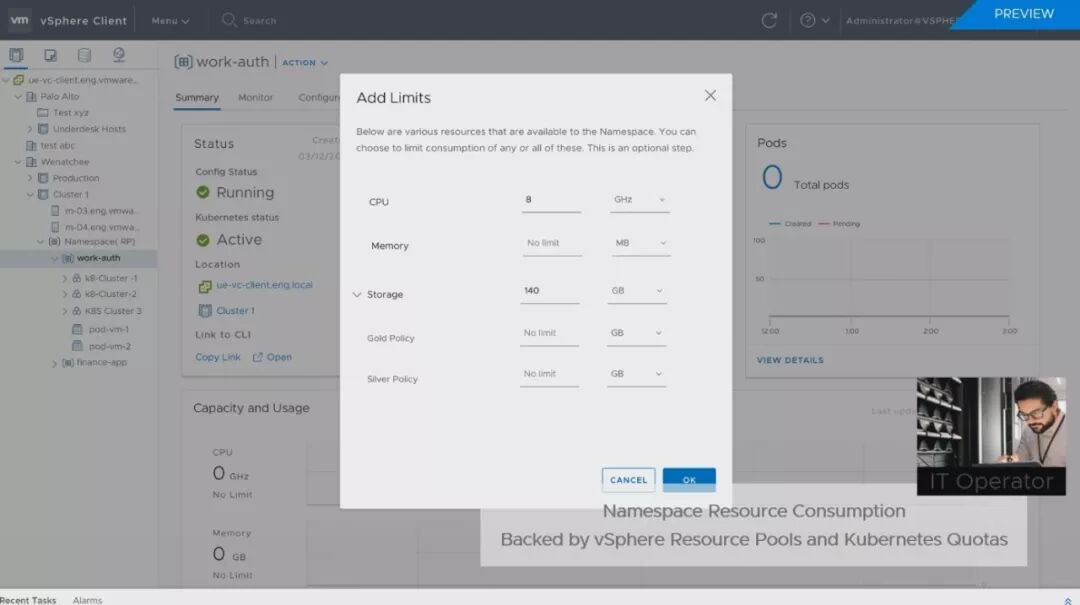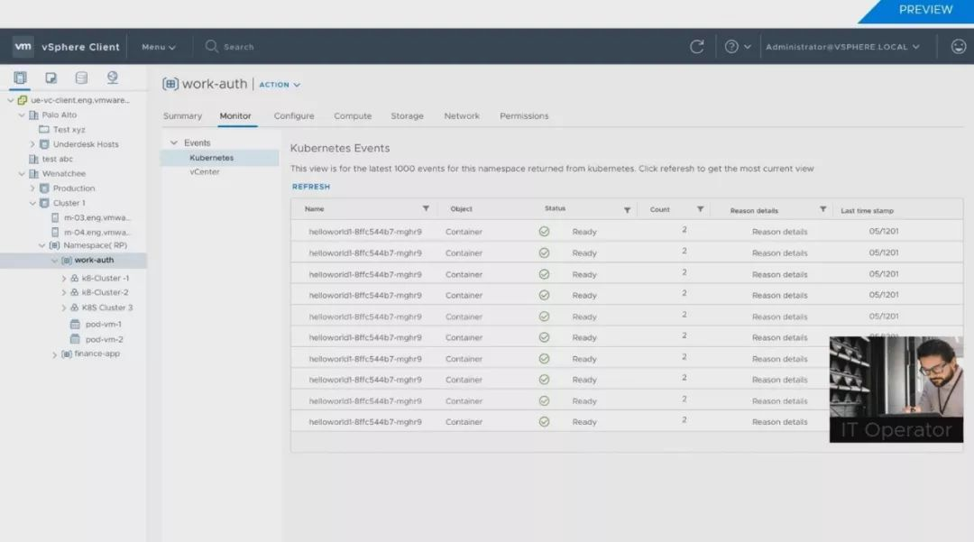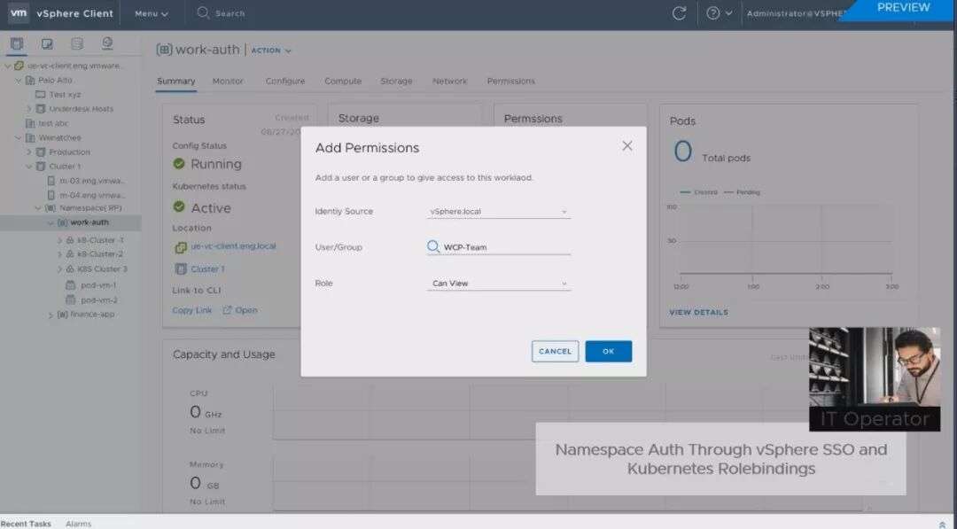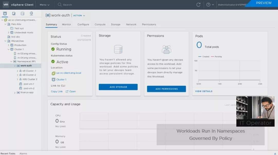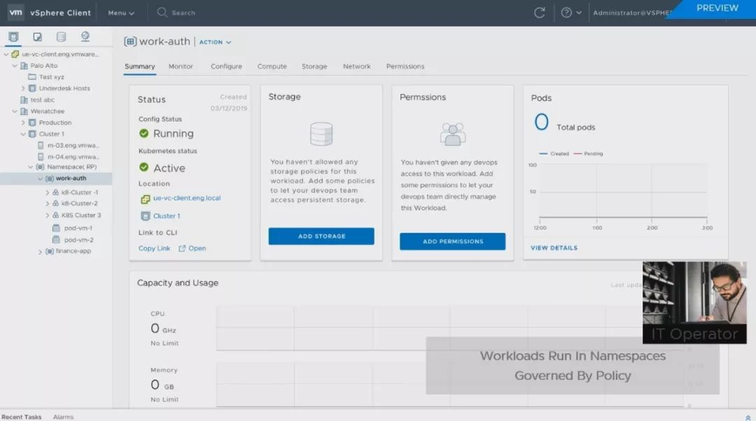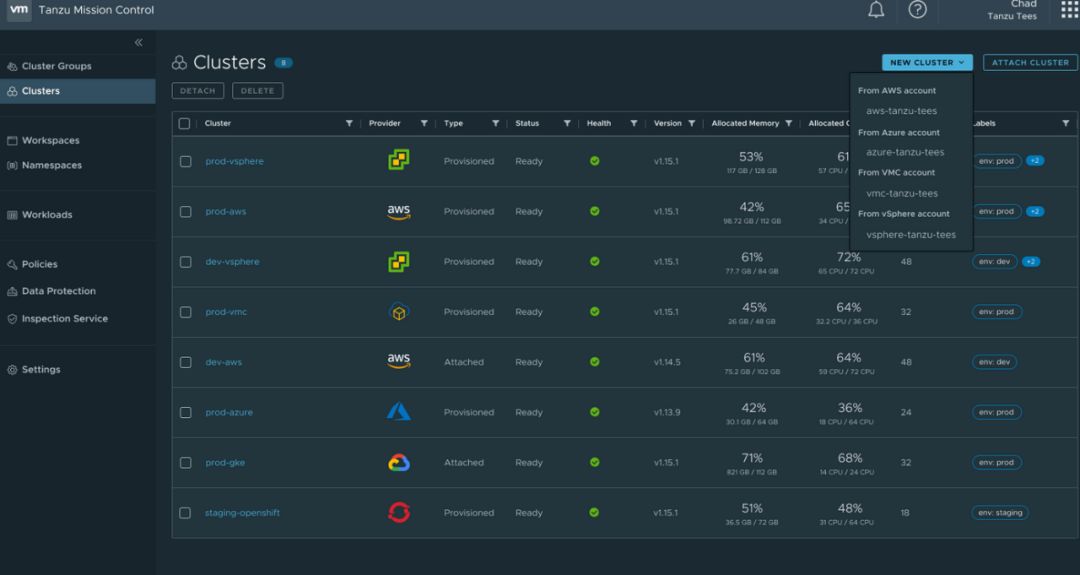 VMware研发副总裁也是K8s项目创办人Craig McLuckie直言,这就是vSphere的未来发展。VMware决定全力拥抱K8s,而且直接改以K8s为底层,重新打造新版vSphere。在太平洋计划中,VMware将vSphere的核心ESXi,换成了一个超级K8s集群,将K8s API整合到vSphere的API中,让企业运维团队,可以像ESXi管理VM那样,来运用K8S的能力,而vSphere也将变成了一款K8s原生产品。 现有的vSphere需搭配Pivotal的PKS来创建K8s集群,但未来,新版vSphere能直接创建和部署K8s集群。这个整合的另一个新特色是,同时将K8s的分布式基础架构管理能力,带进了VM世界,K8s的YAML配置文件,现在也可以用来配置VM。不只容器,连VM的基础架构资源都可以程序代码化了。 新发表的Tanzu Mission Control则是VMware在K8s布局的另一个关键,这是大规模管理不同环境下K8s集群的关键技术。VMware宣称,可以支持任何环境中部署的标准K8s,包括主流公有云AWS的EKS、Azure的AKS、GCP的GKE、IBM云的IKS,也可支持企业内部部署的K8s环境,如红帽的OpenShift。目前Tanzu Mission Control仍是SaaS服务,已发布第一个测试版,但VMware预告,未来将推出企业内部部署版。而太平洋计画成果,也就是内建K8s的新版vSphere,则将于今年底前发布Beta测试版。 不过,在今年VMworld上,VMware也展示了新版vSphere和Tanzu Mission Control最新的管理画面,例如新增加了新的管理单位Namespaces,可对K8s和VM套用同一个策略。 从这些展示画面中,可以看到vSphere如何整合K8s集群的管理界面,一看VMwarer心目中未来横跨VM世界和K8s世界的新管理方式。