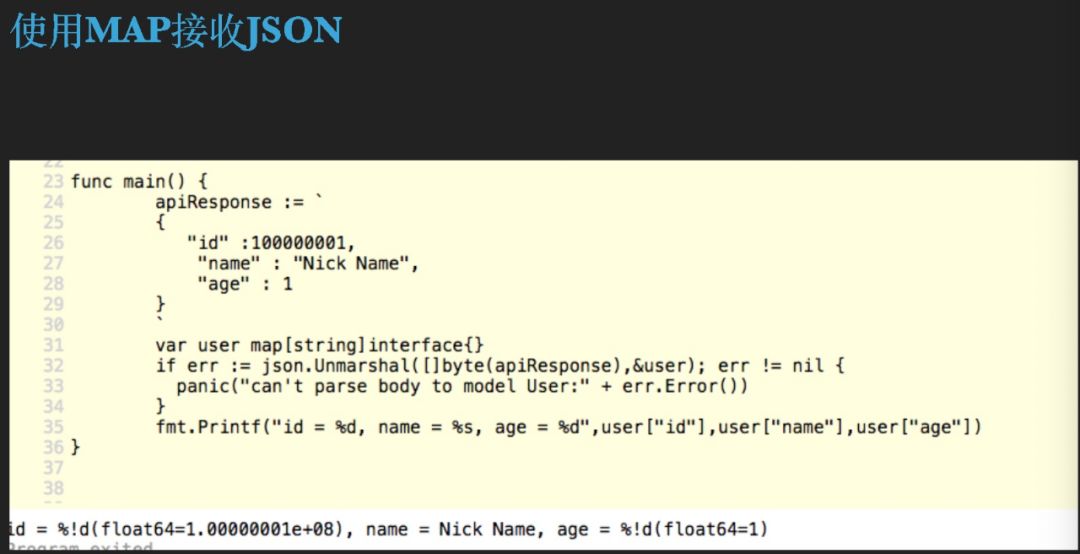 我们再来看一下,当我们用 map 来接收的时候好像不太一样了,为什么所有这种数字的类型已经变成了一个 float64,而不是一个 int。