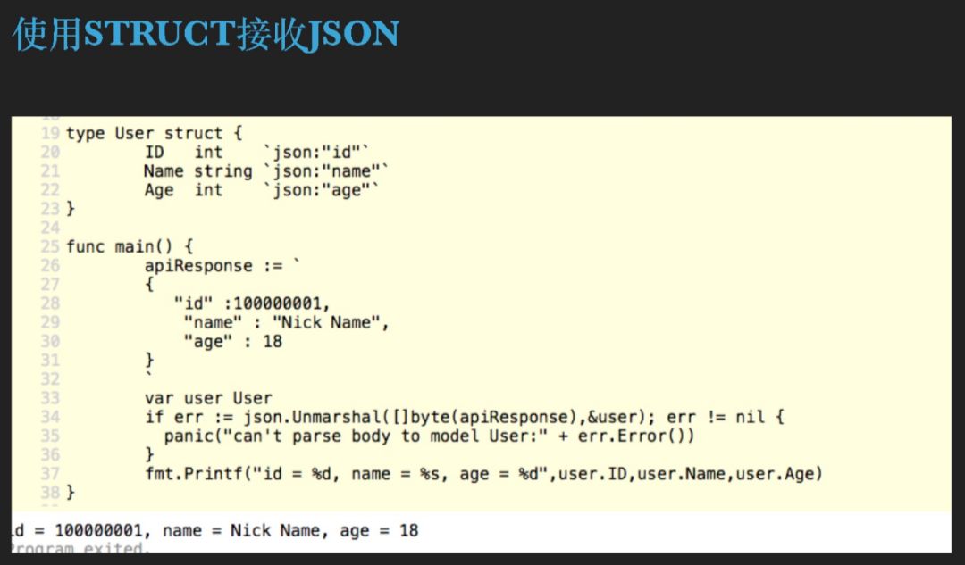 这个代码描述了我们怎么去用 struct 去接受一个JSON,我们定义了一个 struct,模拟了一个返回,把它们可以反序列化。我们看一下它的打印,跟我们的预期应该是一样。