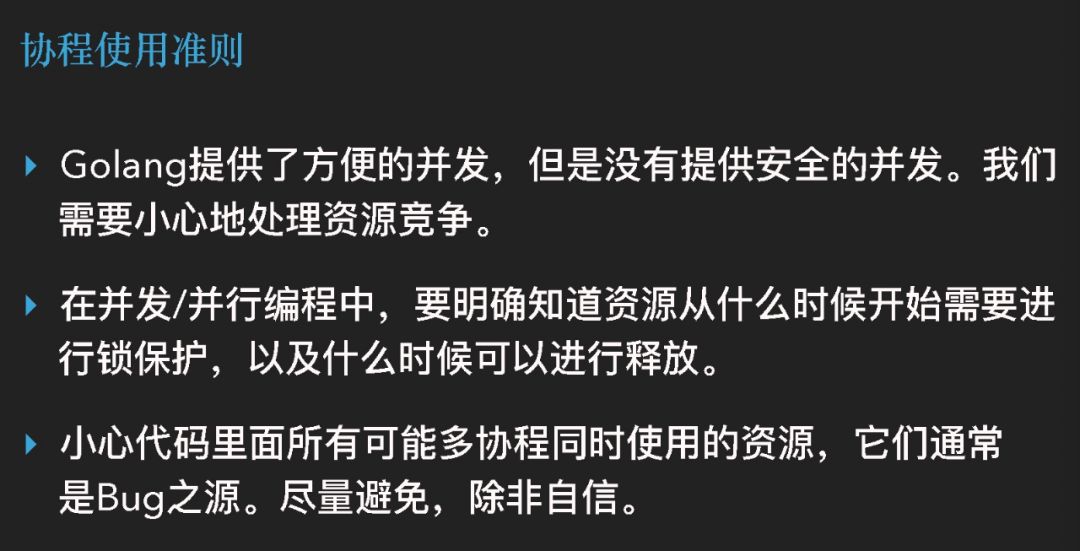 这是我个人的感受。Golang提供了很方便的并发,但是它没有提供安全的并发,我们仍然需要非常小心地去处理这些资源竞争,以及要非常小心地知道我的资源什么时候开始去锁,什么时候开始解锁。