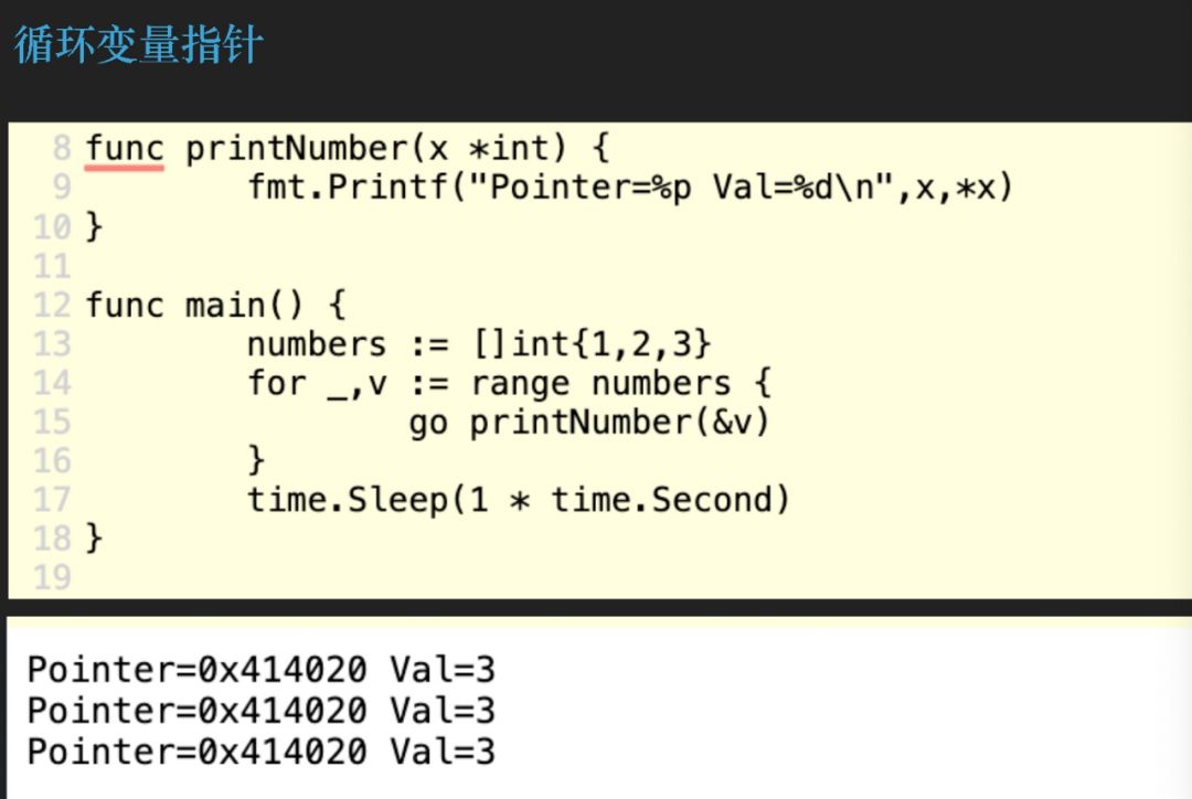 我们来看,最后输出的全部是 3。如果大家写过 C 代码可能对这种情况比较熟悉。我们都知道在 Golang 里面是可以去打印一个指针具体内存地址。我们来看一下这些值内存的类型到底是怎么样?可以发现它打印出来的内存地址都一样,所以说它的值一样,是因为它的指针,其实它是同一个指针,它同一个对象,所以说同一个对象肯定只能有一个值。