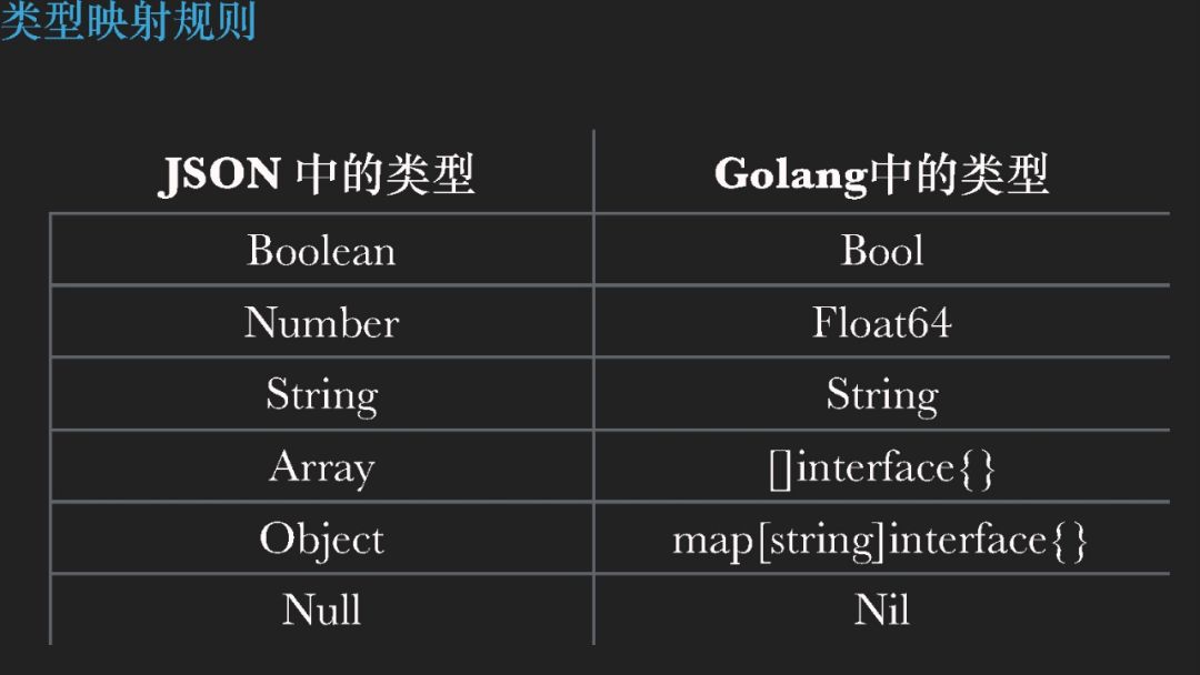 我们这里可以看到在 JSON 中处理这种类型映射关系的时候,当你没有去指明一个类型的时候,它大概会以这样的方式去给你做一个假设。比如说Object,就会用一个map[string]interface{} 来作为接收。这个映射关系是非常有意思的,在我们现在的业务系统开发当中,公司与公司之间的合作,不同编程语言之间的协作变得越来越多,如何去做不同系统之间的映射,技术的映射、类型的映射,甚至一些功能逻辑上的映射,是我们整个系统集成工作里面是一件最最重要的事情。<编注:这个问题的目的是抛出系统集成的话题,希望大家做系统集成工作的时候要非常在意兼容性>