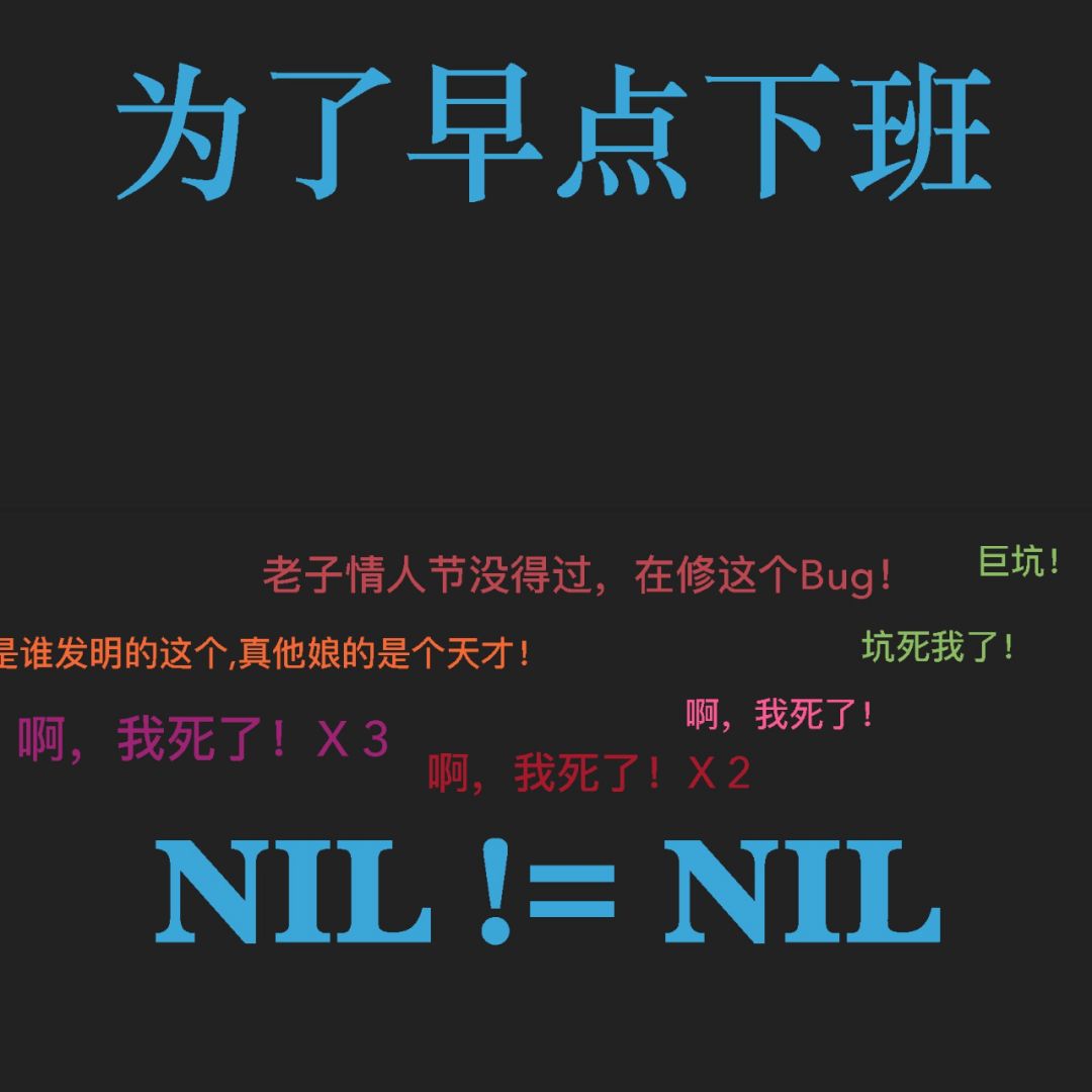 我们先来讲我们第一个问题 Nil 不等于 Nil,这话听上去好像 1 不等于 1 一样, 骗小孩子的病句。其实在 Go 当中有的时候确实会发生这种问题,当我们认为我们的变量是 nil 的时候,甚至于我们很信誓旦旦说它是 nil 的时候,它其实并不是。