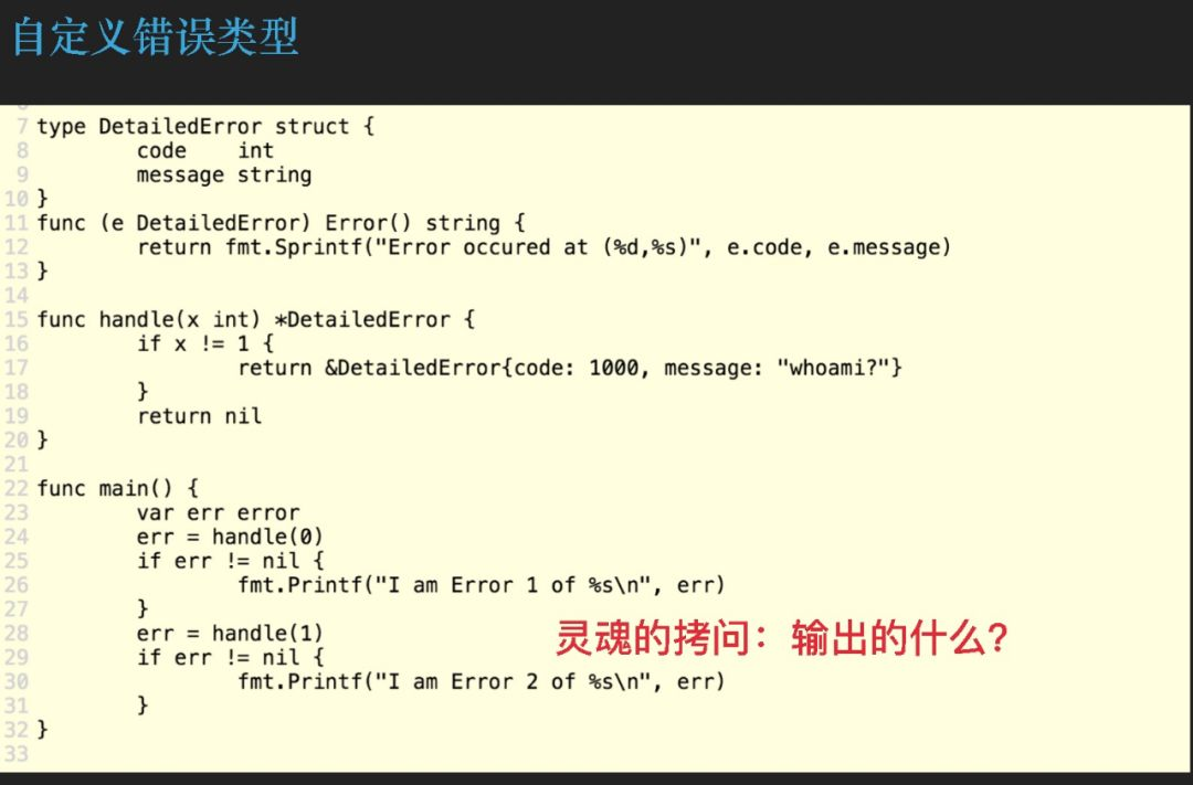 我们定义了自定义的错误类型,handle函数中判断了参数x的值是否等于1,如果不等于1就返回一个自定义的Error指针类型。否则就返回一个nil。在main函数中,我们分别用参数 0 和 1 调用了两次,然后判断了error是不是nil,不是nil 就打印一句话。好像就是一个很寻常的go函数。