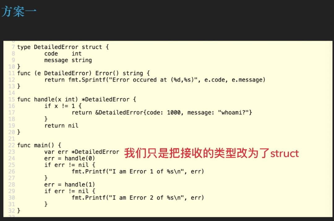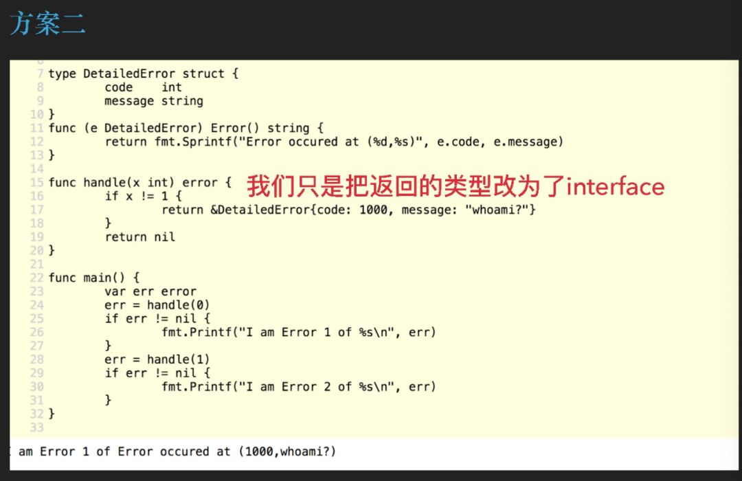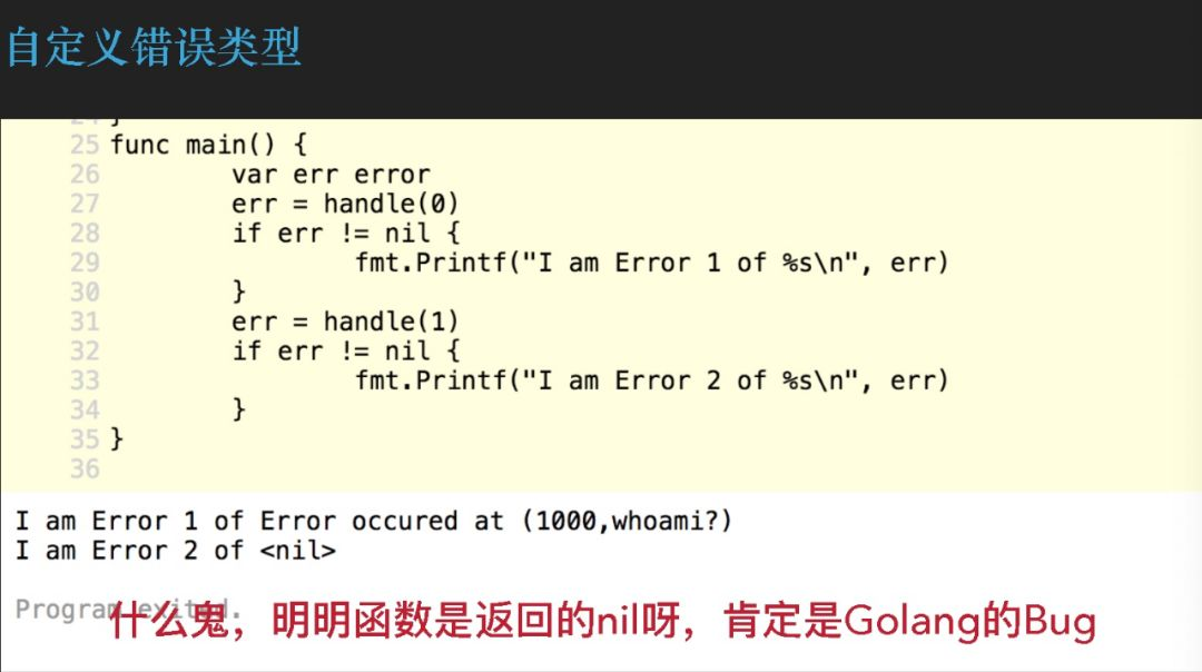 我们还会有第二种方案,我们看一下,我不返回这一个 struct,我返回一个 error,这样再打印第 30 行的 err 就真的是 bug 了😂。