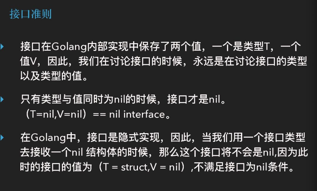 第三点,我们都知道接口是隐式实现的,当我们用一个接口类型去接收一个 nil 结构体的时候,这个结果将不是 nil,因为此时的接口值是有类型(T)的, 只是它的值(V)是 nil,所以说我们刚才的 if 判断应该是成立的。