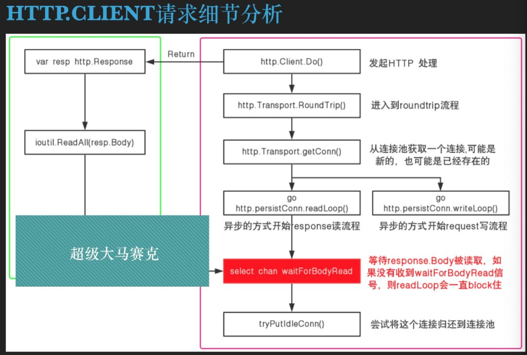 这里面有个很重大的问题,这个信号什么时候到来?我们来看一下马赛克后面的内容,其实就是我们在调用这一个 Response.Body.Close 的时候,它就会发出WaitForBodyRead的信号,这也是我们在网上看到很多的文章都会提醒你做一个HTTP请求,不要忘记关闭 Body,这就是问题的本质,其实关闭 Body 这件事情没有做很多的事情,比较有意义的就是利用 Body这个信号需要去完成整个的生命周期。