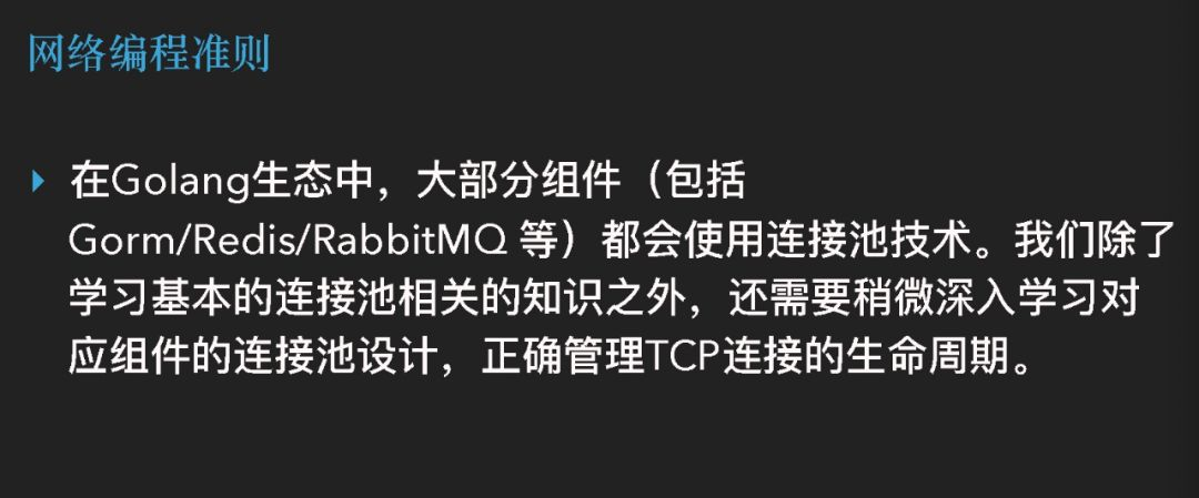 所以我们除了要学习基本的连接池相关的知识,比如说为什么需要连接池,以及连接池能够解决什么问题,我们还要去稍微深入地去学习一下,我们用的这些库的连接池设计我应该怎么样才能够正确管理好的我的TCP 连接,这是我们作为一个业务层是要掌握的一些网络方面的知识,我们一定要知道我们在用一个网络库的时候它背后的 TCP 的过程到底是怎么样,它会让我们提前去避免问题。因为这些问题往往是很难被提前发现的。