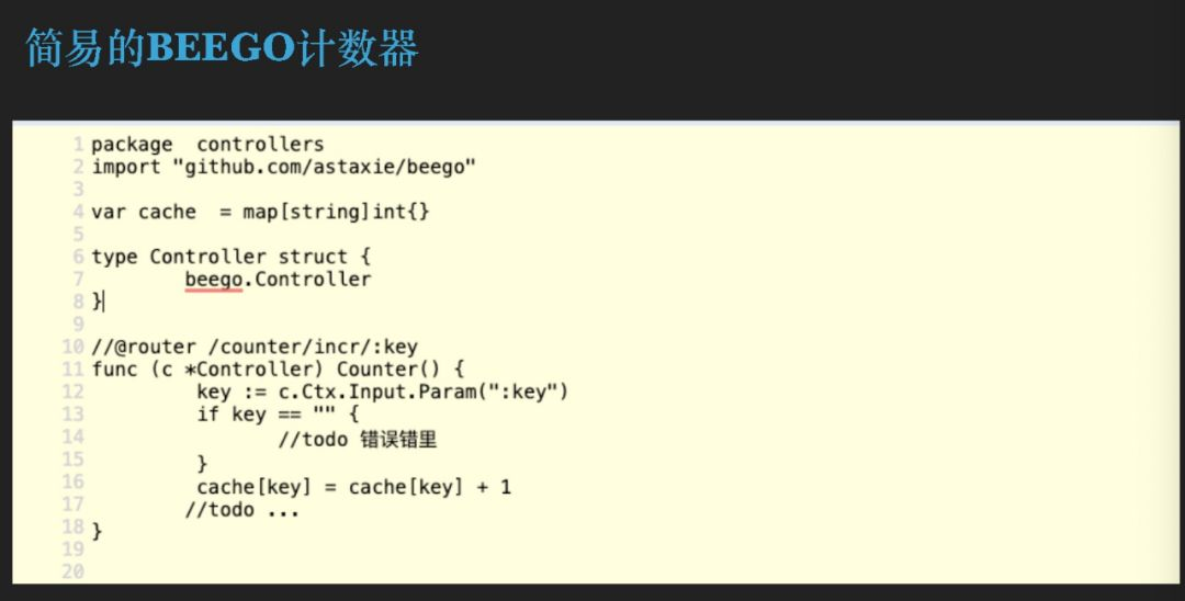 我们先来看一个有关协程小小的 demo,我们用Beego框架开发了一个很简单的 API,没做什么很有意义的事情,只是往map里面写入了一个数据,这个问题应该是很明显的,我们大家应该能够一目了然,很容易知道,因为之前的讲师也有提到过,Go 里面会有并发的读写问题,这里面就发生了并发的读写问题,我们也知道怎么去解决,只要给我们第 16行里面加一把锁这个问题就解决了,这个问题是一个很明显的问题,没有什么特别要提的。