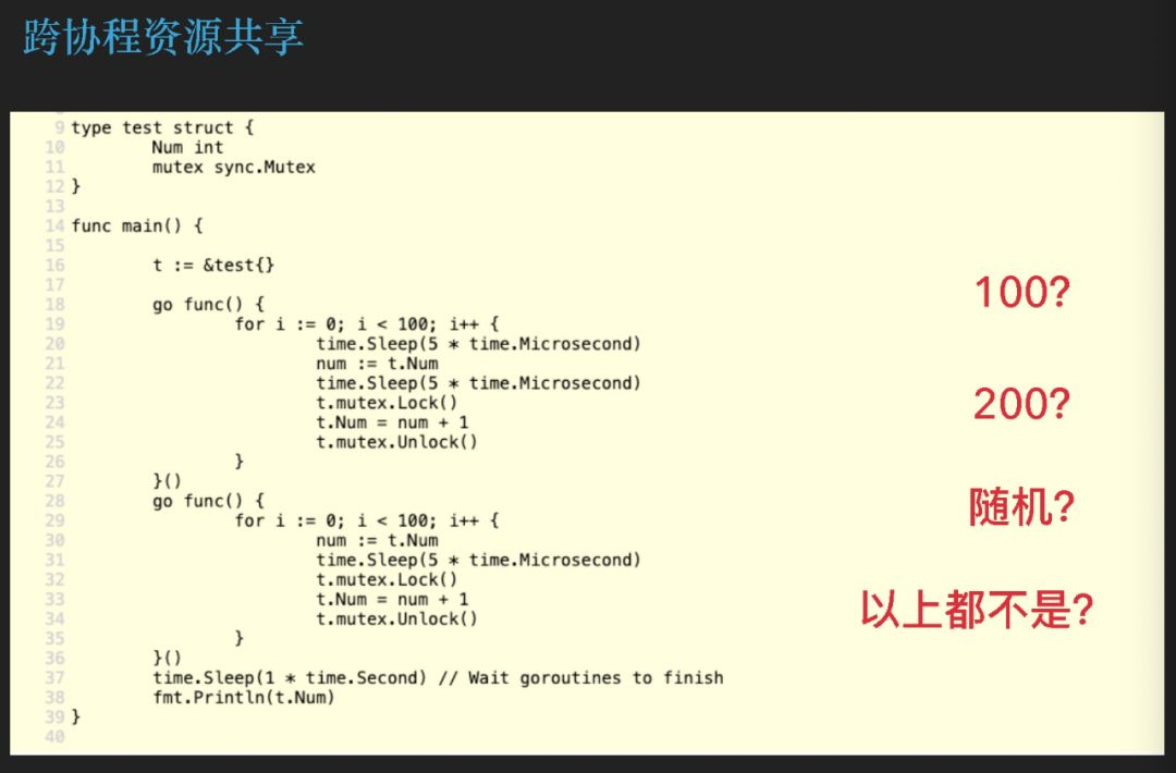 比较有意思的是下面这个问题,我们同时开启了两个协程,在每个协程里面分别循环了 100 次,然后做了一个累加,利用Sleep来模拟了一些网络操作时间,现在我们的问题是最后累加出来的值是多少,这里我可以给大家一分钟时间讨论一下,和身边的小伙伴一起讨论一下。