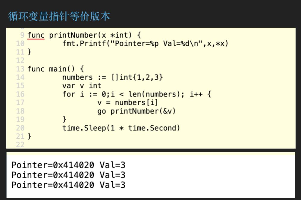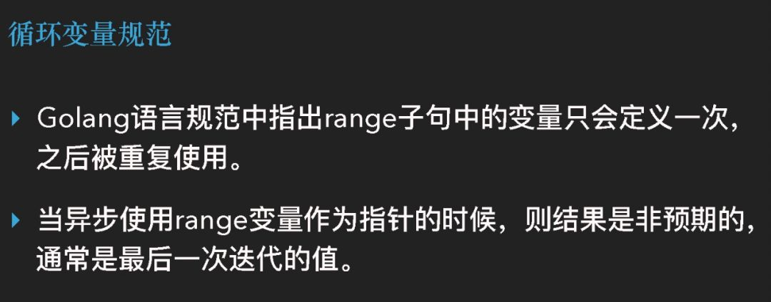 为什么会一样呢?其实这只是一个设计而已。在 Golang 语言规范当中就指出了range 子句中的变量只会定义一次,就是我们刚才上面第 15 行,然后它会被重复使用,我们循环里面去给它们不停地赋值。第二点,当我们异步应用协程的方式去使用 range 变量这个指针的时候,其实它的结果是非预期的,不过这种情况一般是最后一次迭代的值。