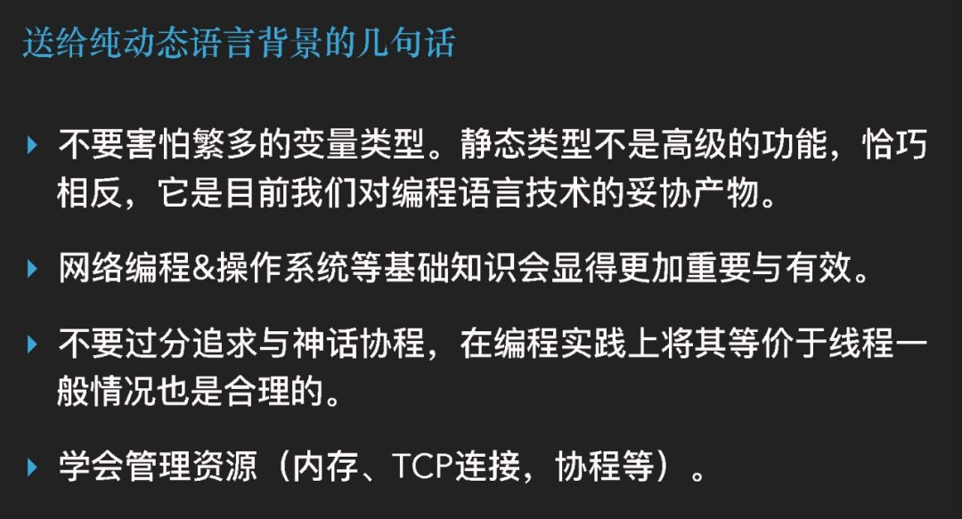 作为一个纯动态语言背景的开发者,老是会害怕这些个变量啊,类型啊。其实我想跟大家说的是这些都不是高级的玩意,恰恰是低级的,它是我们对编程语言技术的一个妥协,因为我们要给编译器更多的信息量,它才可以帮我们自动做更多工作。然后我们这个时候因为 Golang 里面,脚本语言是托管语言,它是在另外一个程序上工作,所而 Golang 是直接运行在操作系统上面,所以一些操作系统的调度、网络编程支持在这个时候就会变得有效起来,可能我在写动态语言的时候好像没什么意义,但是我们一旦写这种语言深一点的就会变得有意义。