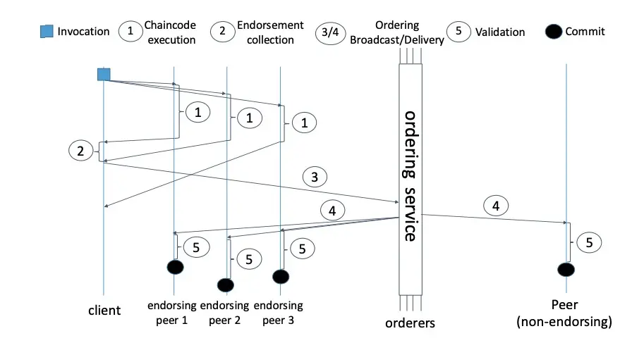 因为在同一个物理节点上扮演不同的角色成为了可能,因此Fabric可以被操作像传统的点对点区块链系统一样,在每个节点维护状态,调用,校验,排序交易。不同节点的交易流程在图三中描述。