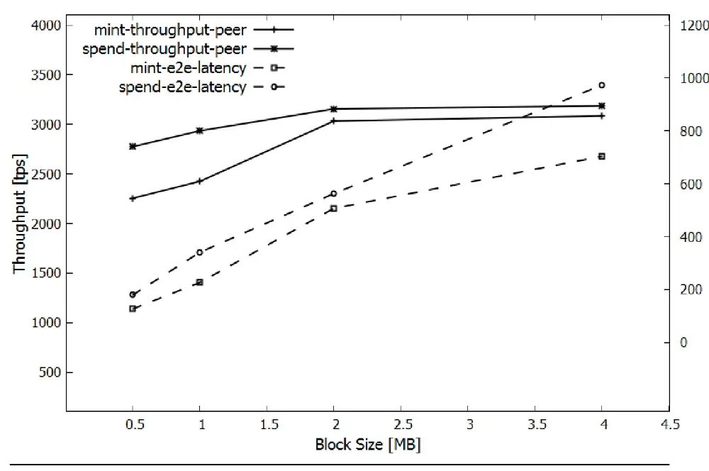 交易规模。在此实验期间,我们还观察了MINT和SPEND事务的大小。特别是,2MB块包含473个MINT或670个SPEND事务,即SPEND的平均事务大小为3.06kB,MINT的平均事务大小为4.33kB。通常,Fabric中的事务很大,因为它们带有证书信息。此外,Fabcoin的MINT交易大于SPEND交易,因为它们带有CB证书。这是Fabric和Fabcoin未来改进的途径。
