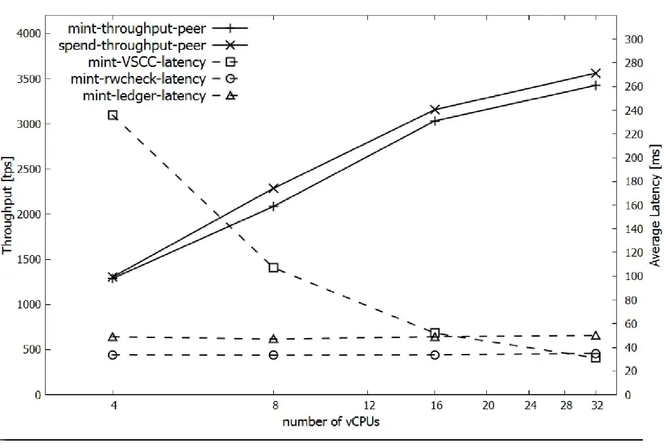 对等CPU的影响。 Fabric对等体运行许多CPU密集型加密操作。为了估计CPU对吞吐量的影响,我们进行了一系列实验,其中4个对等体在4个,8个,16个和32个vCPU VM上运行,同时还进行了块验证的粗粒度延迟分级以更好地识别瓶颈。我们的实验侧重于验证阶段,因为Kafka订购服务的订购从未成为我们实验的瓶颈。验证最后,在本实验中,我们测量了32-vCPU对等体上每秒3560个事务处理(tps)的平均SPEND吞吐量。一般来说,MINT吞吐量略低于SPEND,但差异仍在10%以内。