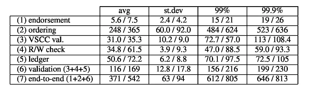 尽管Fabric尚未经过性能调整和优化,但我们将在本节中报告一些初步性能数据。Fabric是一个复杂的分布式系统;它的性能取决于许多参数,包括分布式应用程序和交易大小的选择,排序服务和共识实现及其参数,网络中节点的网络参数和拓扑,节点运行的硬件,节点数量和通道,进一步的配置参数和网络动态。因此,Fabric的深入性能评估被推迟到未来的工作中。