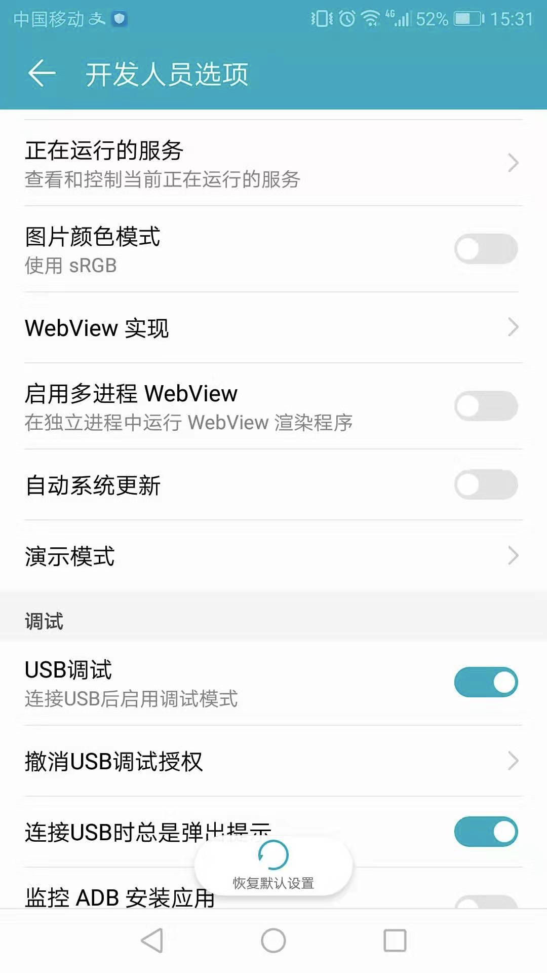 - 手机打开开发者选项,选择允许usb调试(由于安卓机型较多,具体开启方法就不一一阐述)