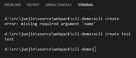 当执行create命令后, 没有提供参数时, 会提示缺少参数name. 提供后, 控制台就输出我们提供的name值.