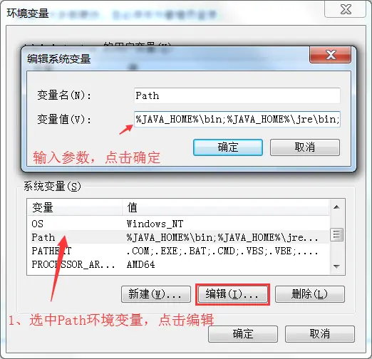 ④接下来选中Path环境变量,点击编辑,在变量值输入框最前面或者最后面的位置输入%JAVA_HOME%\bin;%JAVA_HOME%\jre\bin; (注意分号不能丢)