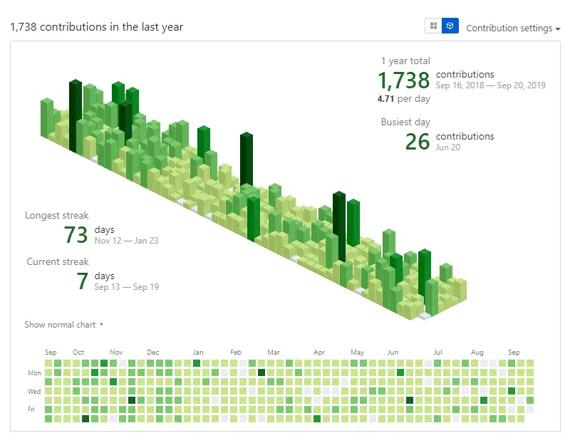 说说我自己吧,在过去的一年里,虽然不是 365 天一直雷打不动坚持 commit,但至少不会说一连断更数周。GitHub 项目保持一定的活跃度是必须的,你只有持续维护项目,更新内容,与其它开发朋友交流互动,才能让你的项目持续得到外界的关注。下面是我近一年的 commit 记录图。
