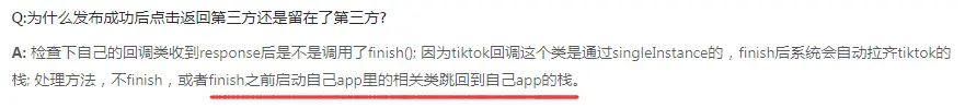 我们来捋一捋这些场景,并结合官方文档来分析。文档描述,tiktok回调这个类是通过singleInstance的,即抖音回调activity的时候,是通过singleInstance启动TikTokEntryActivity的,这个时候的TikTokEntryActivity运行在独立的任务栈里,属于前台任务;当调用到TikTokEntryActivity的onResp方法,执行到startActivity(new Intent(this,MainActivity.class)),启动MainActivity并finish自己,这个时候抖音的任务栈属于前台任务栈,那么自然而然的,新启动的MainActivity就依附在抖音的任务栈上。接着再按返回键,退出了抖音的任务栈,最后才回到自己app的任务栈。