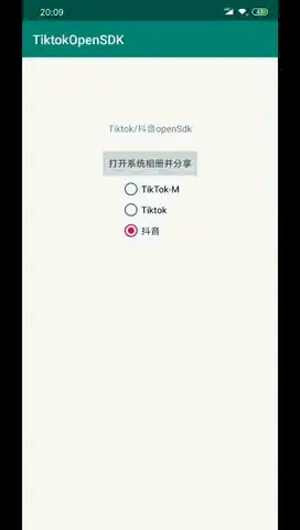(1)在包名下创建.tiktokapi.TikTokEntryActivity,初始化TTOpenApi,实现 TikTokApiEventHandler接口,在onResp方法中回调结果。(和微信回调类似)