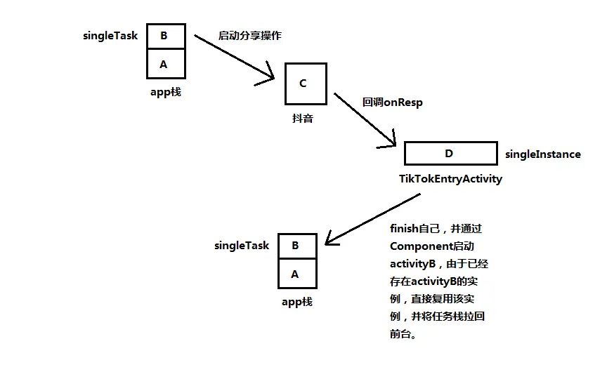 (1)app栈顶activityB唤起抖音分享,启动模式为singleTask;